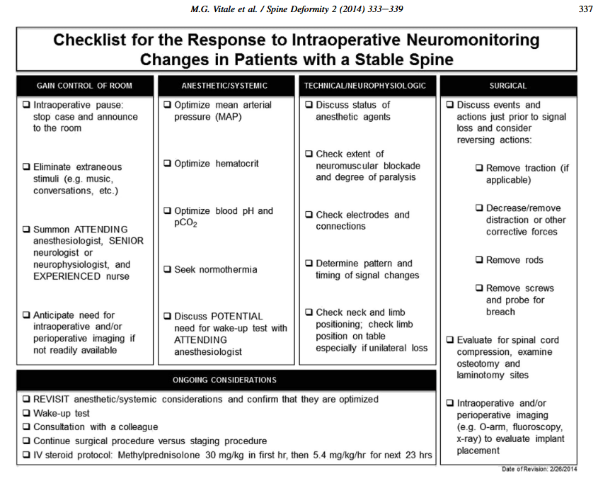 Vitale MG, Skaggs DL, Pace GI, Wright ML, Matsumoto H, Anderson RC, et al: Best practices in intraoperative neuromonitoring in spine deformity surgery: development of an intraoperative checklist to optimize response. Spine Deform 2:333–339, 2014